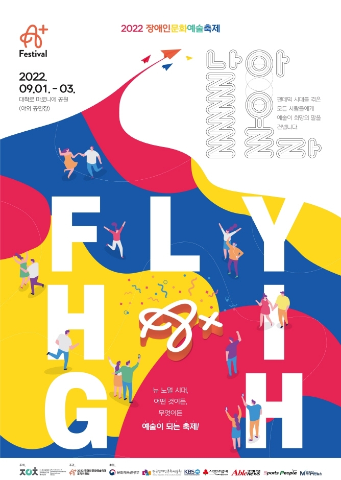 장애인문화예술축제 A+ Festival은 장애인들의 잠재적 가능성(Ability), 열린 접근성(Accessibility), 활기찬 역동성(Activity)을 모토로 장애인과 비장애인이 예술(Arts)로 함께(All Together)한다는 취지로 2009년부터 시작하여 올해 14회를 맞이한다. 2022 장애인문화예술축제는 펜데믹시대를 겪은 모든 사람들에게 장애인 문화예술이 희망의 날개를 달고 날아오른다는 의미의 “날아올라”란 슬로건으로 9월 1일부터 3일까지 대학로 마로니에 공원 일대에서 개최된다.
