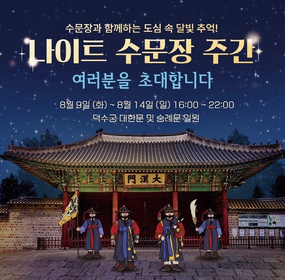 이번 '나이트 수문장 주간(WEEK)' 특별행사는 8월 9일(화)부터 14일(일)까지 오후 4시부터 10시까지 진행되며, 기존 재현행사에 시민들이 즐길 수 있는 체험 프로그램을 더 해 다채로운 행사로 진행될 예정이다.