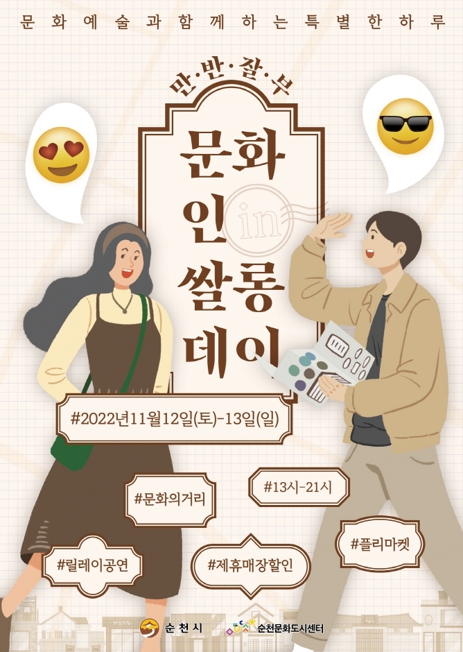 문화인 쌀롱데이는 문화특화지역 중심 문화도시 사업의 일환으로 전시 공간 및 카페 인프라를 갖춘 순천 원도심 일원에서 즐기는 작은 축제이다.