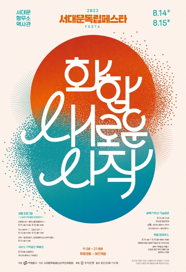 광복 77주년을 맞아 <2022 서대문독립페스타>가 서대문형무소역사관에서 개최된다. 광복의 기쁨, 자유와 평화의 소중함을 가족과 함께 누려보자. 축제기간 역사관 관람, 프로그램은 무료로 이용할 수 있다. 광복77주년 축하공연, 체험 프로그램은 축제 홈페이지를 통해 온라인 사전예약할 수 있다.