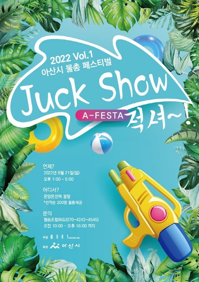 물총페스티벌 ‘적Show’는 아산시가 후원하고 협동조합 와트(WATT)가 주관하는 사업으로, 주관단체가 마을축제 명소화 지원사업으로 선정돼 개최된다.