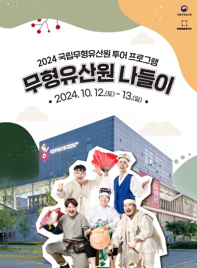 ‘무형유산원 나들이’는 5명의 명인 캐릭터와 함께 국립무형유산원을 거닐며 전문 배우들의 살아있는 해설을 듣고, 공연 또는 체험을 즐길 수 있는 투어 프로그램이다. 무형유산 보유자로 설정된 5명의 캐릭터는 무형유산에 대한 흥미로운 이야기를 들려줌으로써, 우리가 왜 무형유산을 알아야 하고 지켜야 하는지에 대해 일깨워 준다. 또한, 어울마루(회의장), 열린마루(전시·보관공간), 누리마루(복합공간), 얼쑤마루(공연장), 전승마루(교육·창작공간) 등 국립무형유산원의 공간에 대해 알기 쉽게 설명함으로써, 시민들이 국립무형유산원을 보다 쉽고 유익하게 활용할 수 있도록 구성하였다. 전문 배우들과 함께하는 해설 투어 후에는 10월 12일(토) : 1회차 만들기 체험(전통탈 점핑돌 만들기), 2회차 공연 관람(8세 이상 관람 가능) / 10월 13일(일) : 1회차 만들기 체험(전통탈 점핑돌 만들기) / 2회차 만들기 체험(전통탈 점핑돌 만들기)의 기회가 주어진다.