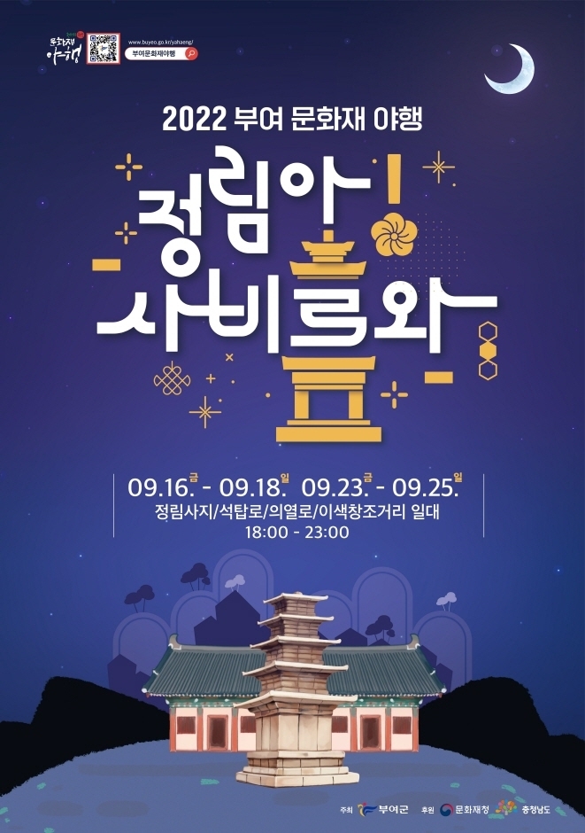 문화재의 이야기에 취하는 부여 문화재 야행이 관광객을 기다린다. 문화재 야행 사업은 문화유산을 중심으로 주변의 다양한 문화예술 콘텐츠를 연계 활용해 야간에 특화된 문화체험 프로그램으로 지역경제와 관광산업 활성화를 도모하고자 문화재청에서 진행하는 공모사업으로 이번 2022부여문화재야행『정림아! 사비로와!』는 백제의 아름다운 문화유산 정림사지를 중심으로 주변의 문화시설 콘텐츠를 활용한 야간 문화향유 프로그램이다.
