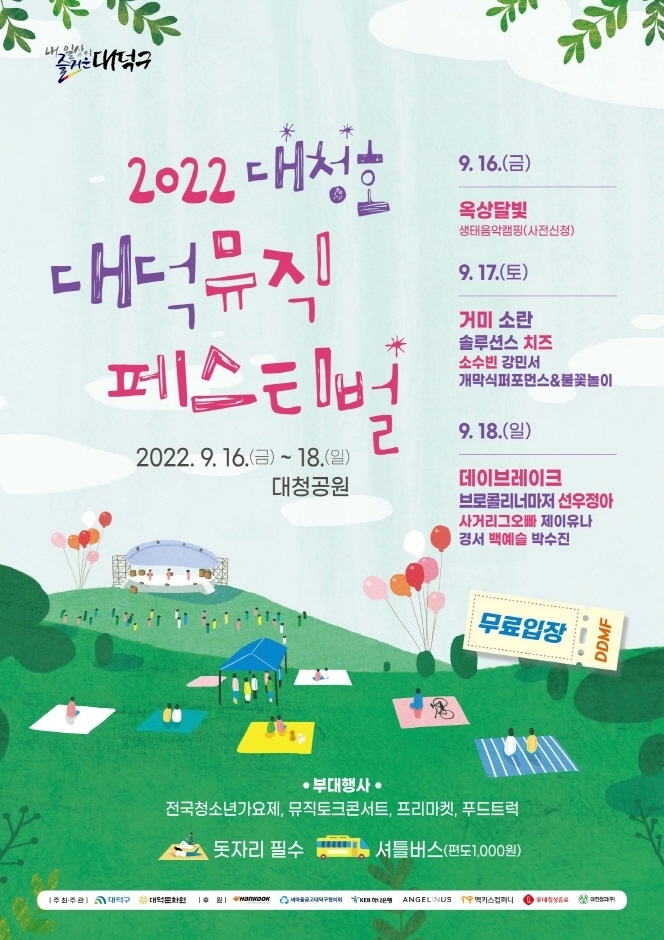 매년 대전 대덕구의 대표 관광지인 대청공원에서 펼쳐지는 라이브 음악축제로 자연과 사람, 음악이 함께하는 소풍같은 축제이다. 아름다운 자연속에서 감미로운 음악을 들으며 사랑하는 사람과 소중한 추억을 만들어보길 바란다.