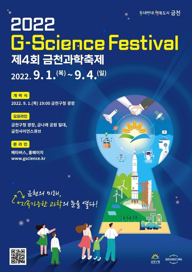 제4회 금천과학축제「2022. G-Science Festival」은 2022년 9월 1일(목) ~ 9월 4일(일) <4일간> 금천구청 광장, 금나래 공원 일대, 금천사이언스큐브와 온라인 사이트, 메타버스에서 진행된다. 4차 산업 기술을 직접 체험하고 즐길 수 있는 기회를 제공하여 미래 창의과학인재를 양성하고, 과학 특화 도시 금천의 과학 문화 붐을 조성하고자 한다.