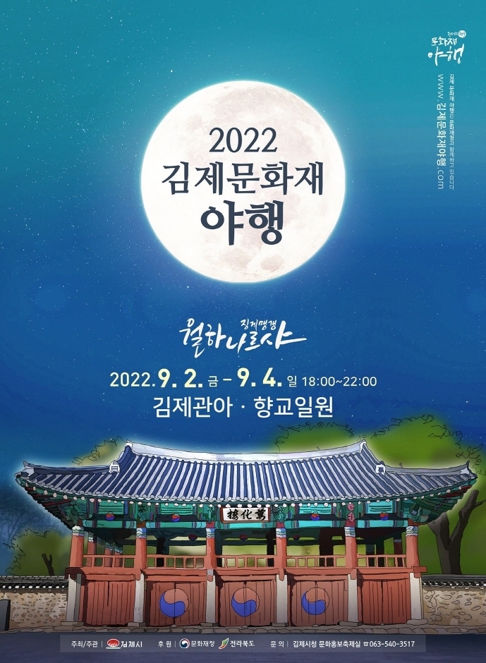 8夜를 테마로 한 다양한 전시, 체험, 공연을 통해 문화유산을 다채롭게 즐길 수 있는 김제의 밤에 여러분을 초대한다.