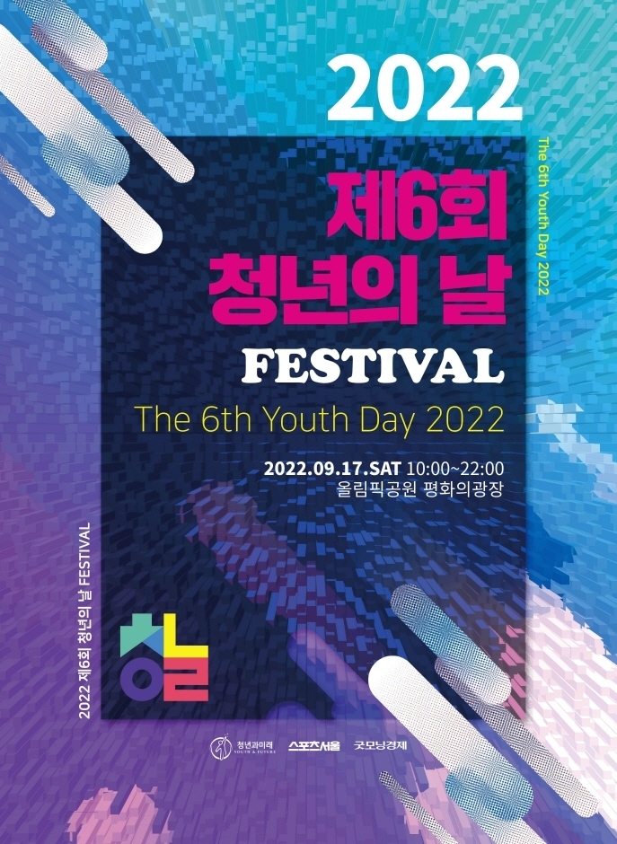 대한민국 최초! 청년을 위한 자발적 참여형 종합축제, 2022 제6회 대한민국 청년의 날! 국회사무처 소관 사단법인 청년과미래에서 2016년 부터 법정기념일 지정을 위해 준비해온 청년의 날이, 법정기념일로 지정되었다. 매년 9월 셋째 주 토요일, 더욱 화려해진 라인업과 흥미진진한 프로그램들로 청년들의 심장을 뛰게해줄 [2022 청년의 날]을 기대해보자! 2022년 9월 17일 토요일, 올림픽공원 평화의광장에서 청년의 날이 개최된다.