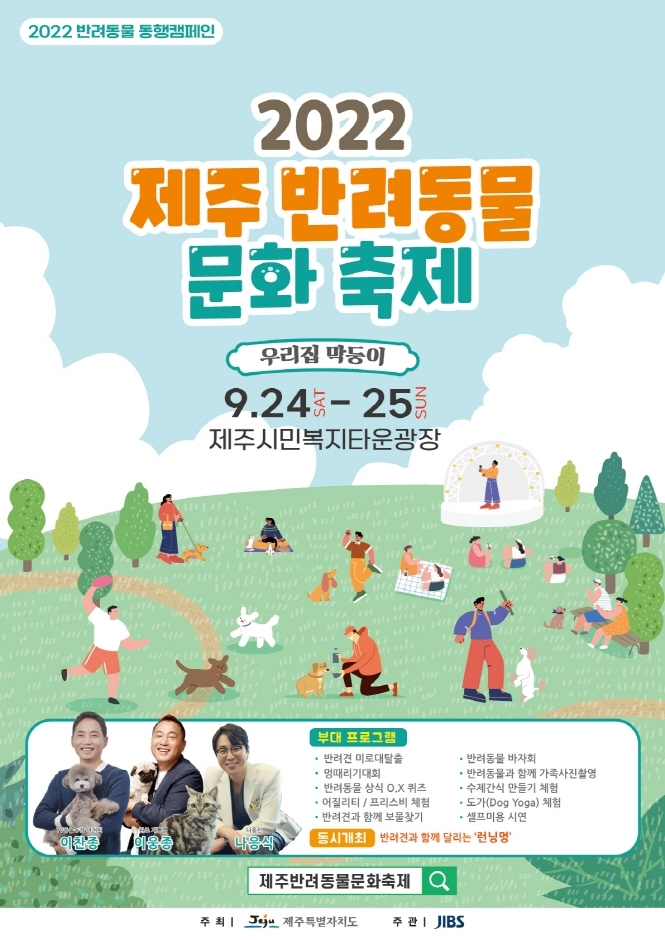 "2022 제주 반려동물 문화축제"는 올바른 반려동물 문화 정착으로 사람과 동물이 행복한 제주를 위한 축제이다. 펫티켓 교육, 성숙한 반려동물 문화 홍보 캠페인부터 각종 반려동물 관련 체험 프로그램까지 반려인과 일반인을 포함한 모든 사람이 함께 즐길 수 있는 다양한 프로그램이 진행될 예정이다. (코로나19 방역 지침에 따라 행사 내용은 변경될 수 있다.)