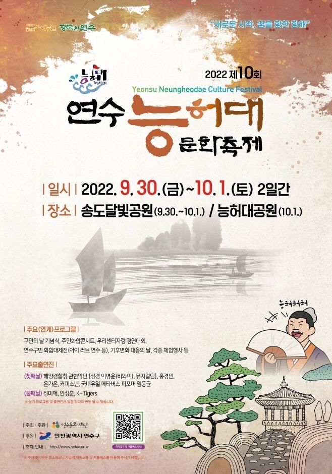 연수능허대문화축제는 고대 해양문화강국 백제의 해상관문인 능허대의 역사를 기념하고 이를 현대적으로 재해석하는 축제의 장으로서 지역대표축제로 자리매김하고 있다. 올해로 10회째를 맞이하는 <2022년 연수능허대문화축제>는 4년만에 개최됨으로써 코로나19로 인하여 지치고 힘든 구민을 위로하고 연수구를 방문하는 관광객들과 함께 즐기고 어울릴 수 있는 축제이다.