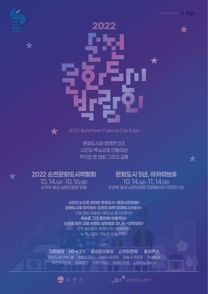 2022년 10월 14일 부터 16일 까지 3일 간 개최되는 순천문화도시박람회는 전시, 공연, 투어, 플리마켓을 포함한 종합 문화예술축제이며, 지난 5년간 순천문화도시센터가 걸어온 발자취를 돌아보는 <문화도시 아카이브展>, 시민의 이야기로 광장을 수 놓는 <시민이야기꾼> 지역 예술인들의 창작/창의문화를 엿볼 수 있는 <아트마켓>, <예술품 하프옥션>, <문화의거리 갤러리투어> 및 다채로운 무대공연 등을 즐길 수 있다.