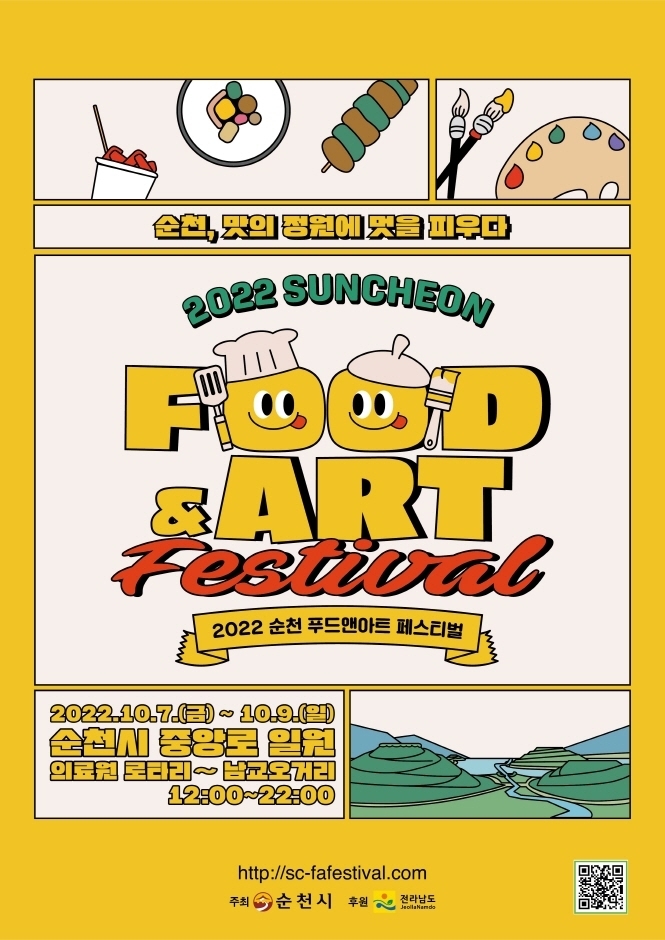 2022년 순천푸드앤아트페스티벌은 « 순천, 맛의 정원에 멋을 피우다 »라는 주제로, 순천 원도심에서 10월7일(금)~9일(일) 3일간 진행된다. 10월 7일 바이브, 포맨, 바다, 이하늘과 함께하는 EDM파티로 축제의 개막을 알린다. 순천의 고즈넉한 문화를 느낄 수 있는 중앙동 일대인 의료원 로터리~남교오거리, 문화의 거리~연자로, 남문터광장, 옥천변에서 진행되는 이번 축제는 순천 시민들이 직접 참여하는 푸드포차, 아트마켓 등으로 풍성한 볼거리, 먹을거리, 즐길 거리를 제공한다. 10월 가을에 순천 시민들에게 풍성하고 마음이 따뜻해지는 소중한 추억을 선물로 제공하는 2022 순천 푸드앤아트페스티벌로 놀러가자.