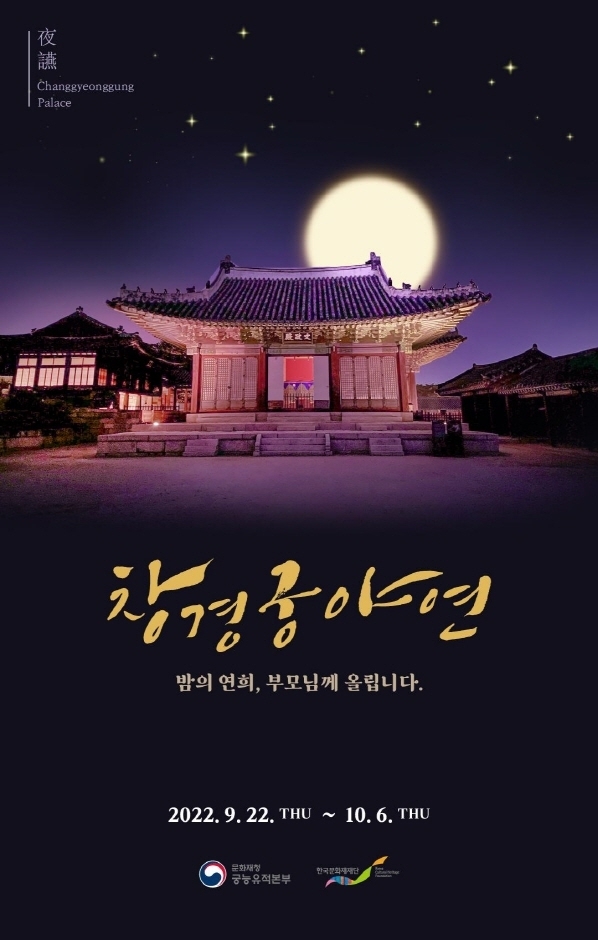 창경궁 야연은 ‘효심’을 주제로 창경궁의 역사·문화적 가치를 반영하여 기획한 야간 체험 프로그램이다. 창경궁 야연은 기존 궁궐 체험과 달리 부모님 중 한 분이 체험자로 직접 참여하고 가족들이 관람객이 되는 프로그램이다. 체험자는 궁중의상과 전통음식을 체험할 수 있으며, 장수사진 및 가족사진을 촬영하여 행사가 끝난 후에는 액자에 담아 기념품으로 증정한다. 자세한 내용은 한국문화재재단 누리집(https://www.chf.or.kr)에서 확인할 수 있다.