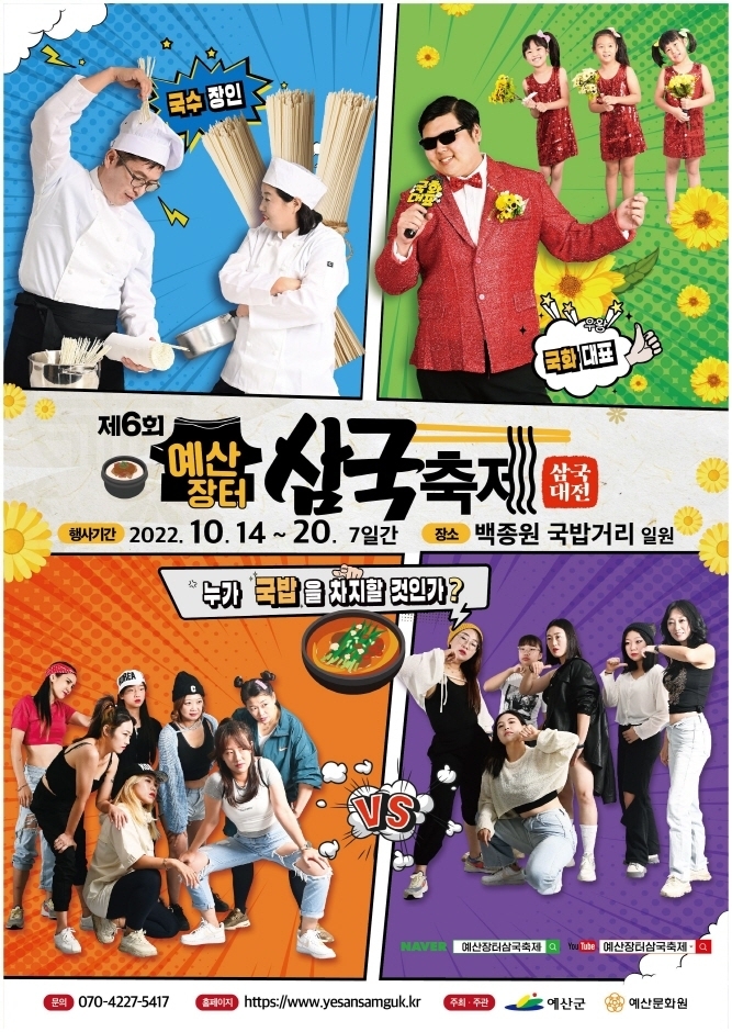 「국화 피워 놓고 기다리는 가을, 흥에 겨워 어화둥둥, 정겨움이 넘치는 예산장터 삼국축제」 예산의 역사와 문화가 가득한 예산장터 삼국축제는 국화 감상과 더불어 국밥을 뜨끈하게 먹고, 집으로 돌아가는 길에 국수 한 다발을 사 가는 맛과 멋이 있는 ‘가을 나들이’ 축제이다. 향기로운 국화, 얼큰한 국밥, 햇빛과 바람으로 만져 만든 국수는 정겨운 인심이 가득하다. 우리 민족의 미덕으로 불리던 ‘훈훈한 인심’을 느낄 수 있는 축제이다. 이번 2022년 예산장터 삼국축제는 모두가 지쳐있는 코로나시대에 몸과 마음이 지쳐있는 군민들에게 희망의 메세지는 물론, 멈춰있는 지역경제의 경제적 지원, 지역 예술인팀 공연단체의 동기부여 등 예전의 활기차고 정이 넘쳤던 그 시간과 현재가 함께 어우러진 온&오프라인 축제로 개최한다.