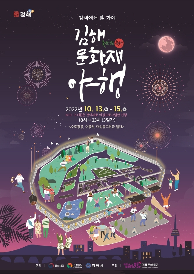 <2022 김해문화재야행: 김해에서 본 가야>이 10월 13일부터 10월 15일까지 김해수로왕릉 일대에서 열린다. 이번 행사는 수로왕릉 후원 조명 및 조형물로 가득찬 야경과, 배우들이 도슨트 하는 수로왕릉 탐방, 전통문화 체험과 공연, 푸드‧플리마켓 등 결합한 축제다. 더욱 풍성한 콘텐츠로 볼거리를 가득 채울 예정이다.