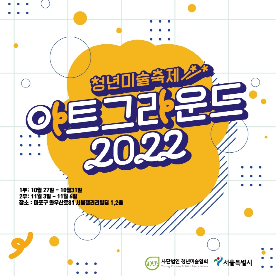 2022년 10월 27일부터 31일 / 11월 3일부터 6일까지 서울 홍대 부근에서 1부과 2부로 나뉘어 진행되는 '대한민국 청년미술축제 : 아트그라운드2022'는 다양한 장르의 청년 아티스트를 발굴하고 참여 아티스트들이 전시를 통해 관람객과 능동적으로 소통하는 장을 만듦으로서 대한민국 청년 미술에 대한 관심을 도출하여 청년 아티스트들의 작업 환경 개선을 도모하기 위해 기획되었다. 청년 아티스트의 작품 전시를 비롯하여 미술강연, 참여 프로그램 등으로 구성된 본 축제는 작업 기법, 제작 등의 학술 교류와 함께 관람객들의 미술 지식 함양을 위한 다양한 프로그램도 함께 진행하여 축제에 참여하는 청년 아티스트와 관람객 모두가 즐기고 배울 수 있는 미술축제의 새로운 장을 제시하고자 한다.