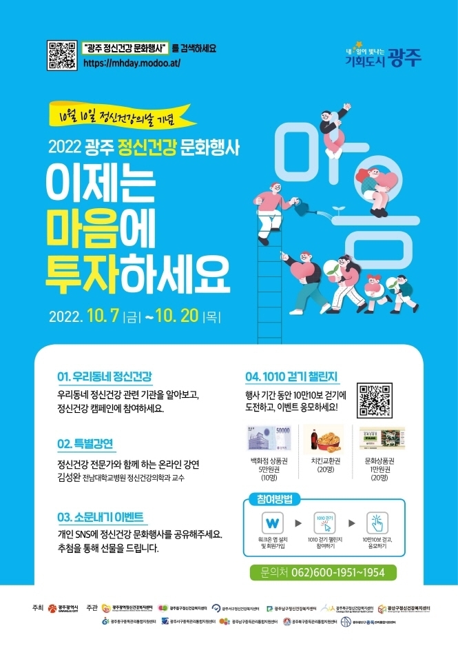 광주광역시에서는 세계 정신건강의 날(10.10.)을 기념하여 10월 7일부터 10월 20일까지 "이제는 마음에 투자하세요"라는 주제로 2022 광주 정신건강 문화행사를 개최한다.