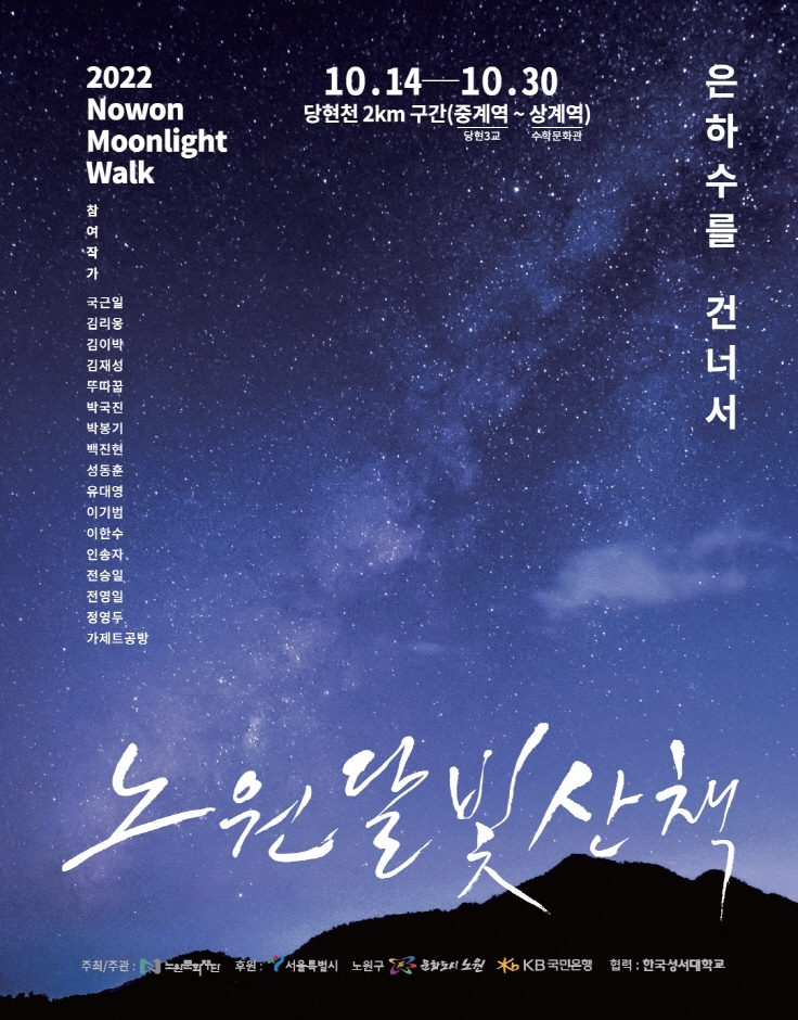 ‘2022 노원달빛산책’은 10월 14일(금)부터 10월 30일(일)까지 17일간 당현천(약 2km 구간)에서 개최된다. 올해로 3회째를 맞이하는 ‘노원달빛산책’은 코로나19의 유행에도 구민들의 공공예술 향유 기회를 단계적으로 향상했고, 노원구의 문화예술 콘텐츠 브랜드로 자리 잡았다. 코로나19 확산상황에서도 남녀노소 누구나 안전하게 즐길 수 있는 새로운 야외행사의 패러다임을 제시한 본 행사는 올해도 안전하게 즐길 수 있는 고품격 워크스루형 축제로 찾아온다.