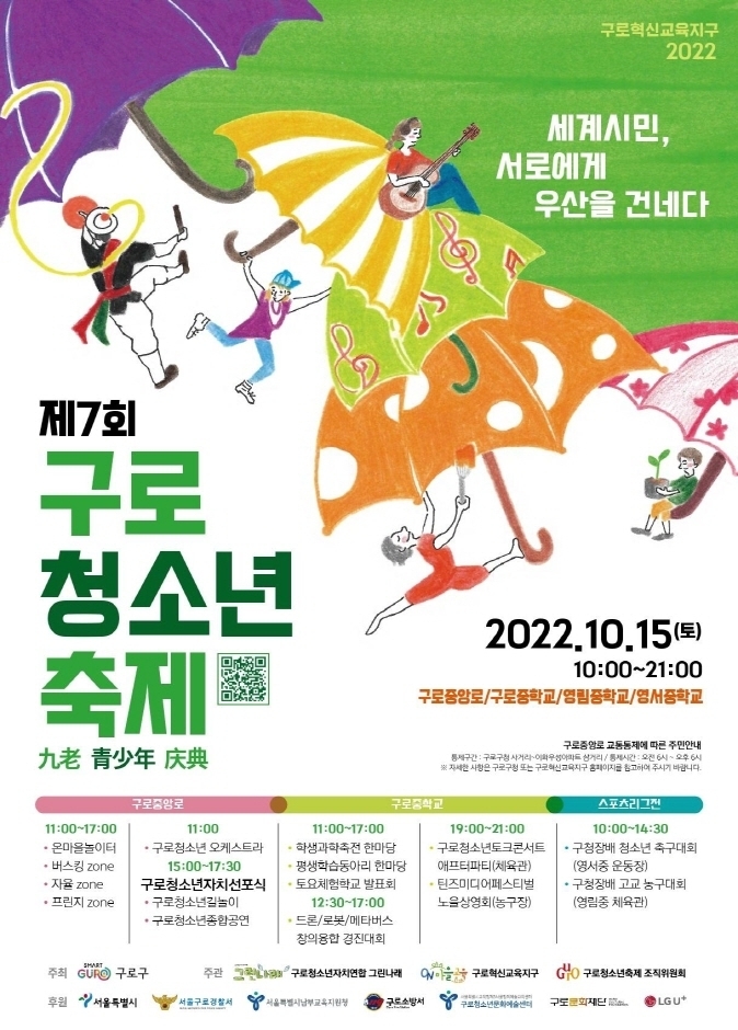 2022 제7회 구로청소년축제가 ‘’세계시민, 서로에게 우산을 건네다"라는 주제로 10월 15일(토)에 구로구청 사거리 및 구로중앙로, 구로중학교, 영림중학교에서 열린다.