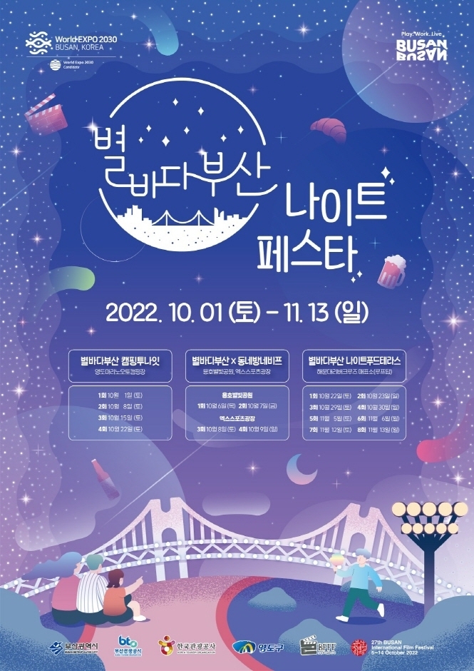 한국관광공사와 부산광역시가 공동으로 10월 1일부터 11월 13일까지 부산 영도, 남구, 해운대구 일대에서 '제 1회 별바다부산 나이트페스타'를 개최한다. 별바다부산 나이트페스타는 부산 시티뷰 야경과 밤바다 속에서 감성 캠핑을 경험하는 '캠핑투나잇', 지역 맥주 등 로컬 음식과 영화를 함께 즐기는 '동네방네비프'. 음식 전문가와 영화에 등장하는 음식을 즐기고 럭셔리 요트로 부산 야경을 감상하는 '나이트 푸드테라스' 등 3개의 프로그램으로 구성됐다.