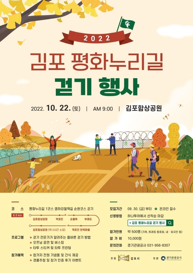 어느새 훌쩍 다가온 가을, 가을의 정취를 느끼며 천혜의 자연이 보존되어 있는 평화누리길을 걸을 수 있는 「2022 김포 평화누리길 걷기 행사」가 다시 대면 행사로 우리 곁에 돌아왔다.