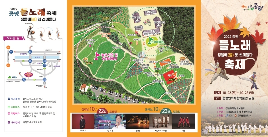 2022 증평들노래축제는 증평군의 대표 농경축제로 전국에서 몇 개 안되는 농경축제의 명맥을 이어가고 있다. 길놀이, 화평기원제, 들나가기, 점심 참놀이, 벼들이기 등 향토유적 12호인 장뜰두레농요 시연을 중심으로 농경체험, 전통음식체험, 고구마캐기, 오감체험 등 다양한 체험행사와 퓨전국악공연, 초대가수 공연 등 다채로운 문화행사가 펼쳐질 예정이다.