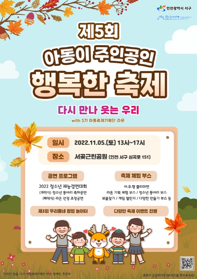 인천 서구청에서 2022 제5회 아동이 주인공인 행복한 축제를 개최한다! 올해 5회째 진행되는 인천 서구 대표 축제로, 아동을 위한, 아동에 의한, 아동축제이다. 5기 아동축제기획단 라온 친구들이 직접 기획한 프로그램을 12월 17일 온라인에서 다양하게 만날 수 있다.