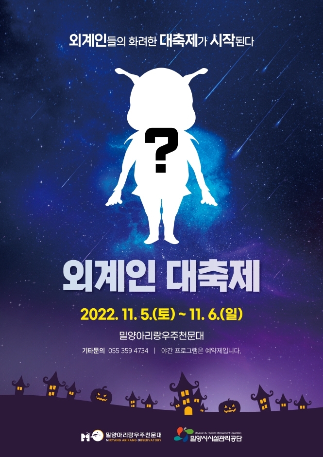 외계인 대축제는 외계인에 대한 이야기를 들을 수 있는 밀양아리랑우주천문대의 대표 축제로, 지난 두 해 동안 코로나로 인하여 연기와 취소를 거듭하다 올해 새롭게 개최된다.