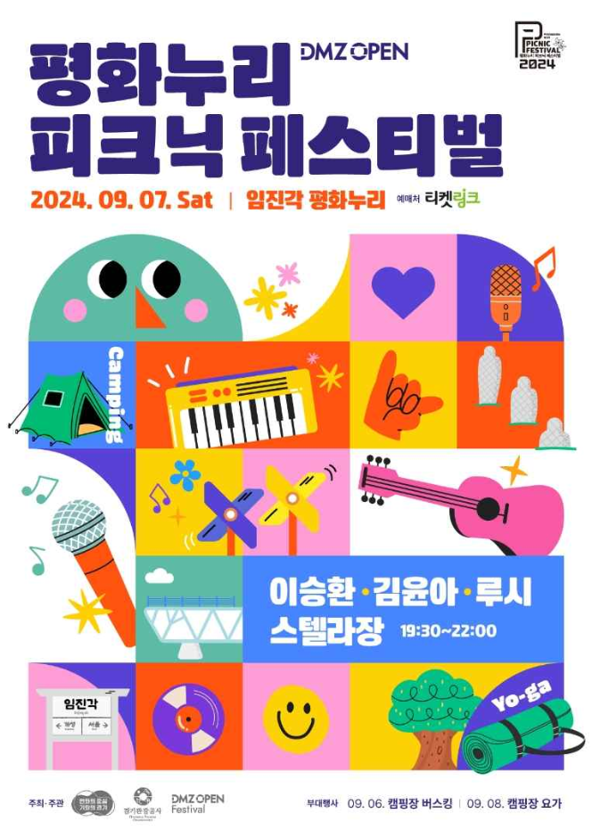 다시 돌아온 2024 평화누리 피크닉 페스티벌! 2024년 가장 인기 있는 아티스트들의 공연을 마음껏 즐길 수 있는 절호의 기회, 임진각 평화누리의 드넓은 잔디에 누워 음식과 함께 소풍 온 듯 페스티벌을 즐겨보길 바란다! 버스킹부터 요가까지 다양한 프로그램이 준비되어 있으니 많은 참여 바란다. - 세부정보: 인스타그램(@DMZOPEN_OFFICIAL)