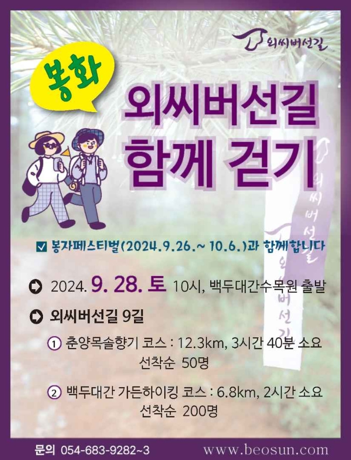 국립백두대간수목원의 봉자페스티벌 기간에 열리는 외씨버선길 봉화 함께걷기 행사이다. 백두대간수목원의 식물들과 호랑이를 만나고, 수목원 바깥쪽의 외씨버선길 9길 춘양목솔향기길을 걸으며 힐링하는 행사이다.