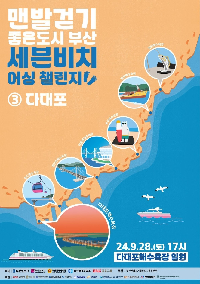 부산일보는 시민 건강 개선과 맨발걷기 친화도시 부산을 실현하기 위해 ‘맨발걷기 좋은 도시 부산 세븐비치 어싱 챌린지’라는 행사명으로 범시민 캠페인을 전개하고 있다. 부산의 7개 해변을 순차적으로 걸어보는 '세븐비치 어싱 챌린지' 중 다대포 편은 3회차 행사로, 다대포해수욕장 해변을 따라 왕복 약 2km를 걷는 행사이다. 참가자 집결지는 다대포해수욕장 백사장 야외무대이며, 몰운대 방면 백사장에서 출발하여 고우니 생태길 방향으로 맨발걷기 후 출발지점으로 다시 돌아오는 아싱 코스로 구성되어 있다. 세븐비치 어싱 챌린지는 2024년 4월 해운대해수욕장, 6월 광안리해수욕장, 9월 다대포해수욕장에 이어 11월 9일 송정해수욕장에서 진행될 예정이며, 2025년에는 송도해수욕장, 일광해수욕장, 임랑해수욕장에서 펼쳐질 예정이다.