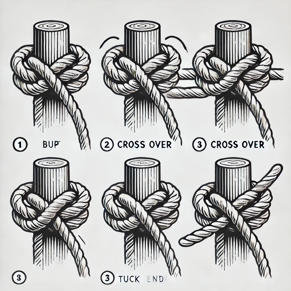 이 매듭은 나무 기둥이나 막대기에 빠르게 묶을 때 유용하며, 길이 조정이 쉬운 것이 특징입니다.
