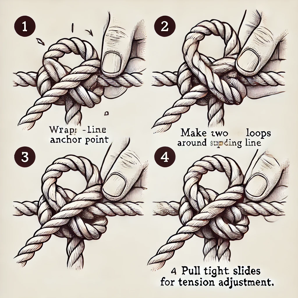 이 매듭은 줄의 길이를 조절할 수 있도록 해주며, 텐트나 타프의 팽팽함을 조절할 때 자주 사용됩니다.